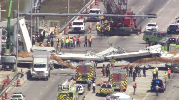 In miami ist ein hochhaus teilweise in sich zusammengestürzt. Bei dem teileinsturz eines mehrstöckigen wohnhauses nahe miami beach ist mindestens ein mensch ums leben gekommen. Hunderte feuerwehrleute sind vor ort, es werden viele opfer befürchtet. Die fußgängerbrücke an der florida international university war erst vor kurzem gebaut worden, um die sicherheit der studenten zu verbessern. Mindestens ein mensch stirbt beim einsturz eines hochhauses in miami, weitere opfer werden unter den trümmern vermutet.
